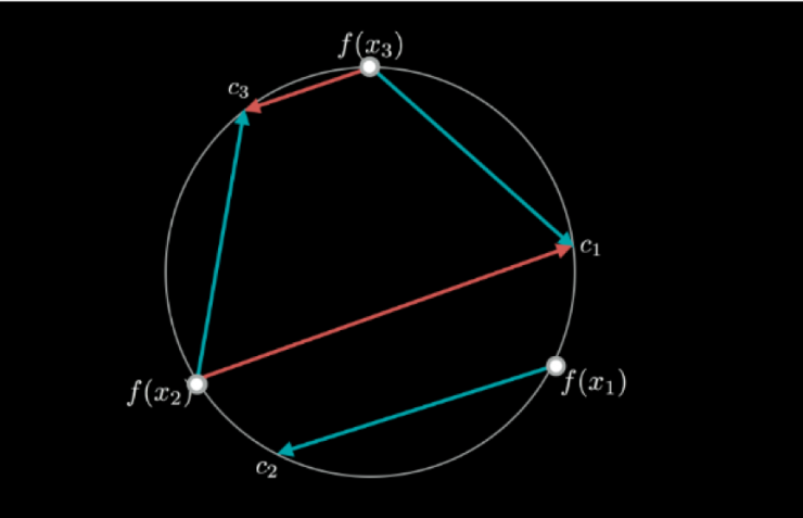 在这个2D的球状单位(圆圈)上的X1,X2,X3分别是三个数据点,这些数据点之间距离相等。是三个可能的噪声分配,三者之间也是距离相等。C1,C2,C3很明显,其中的最优分配就是把X1与C1配对,X2与C2配对,X3与C3配对。