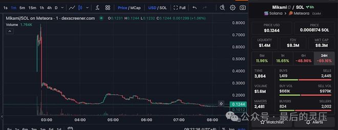 以粉丝作为散户主导的「$MIKAMI」,据报更有忠心fans豪掷574个SOL,以约8万多美元入场。 $Mikami 在5月8号深夜在Solana突然上线,并在自家社交平台宣布将按预售时间顺序分发,初始市值为1690万美元、流通市值为845万美元。
