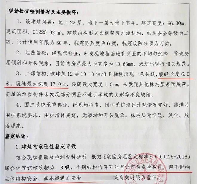 4月2日,枝江市住建局责令开发商湖北姚家港绿色化工投资控股集团有限公司,对房屋进行鉴定。鉴定显示,李先生家天花板裂缝长度6.2米,最大深度1.7厘米,房屋危险等级为B级:个别结构构件可能评定为危险构件,但不影响主体结构安全,基本能满足安全使用要求。