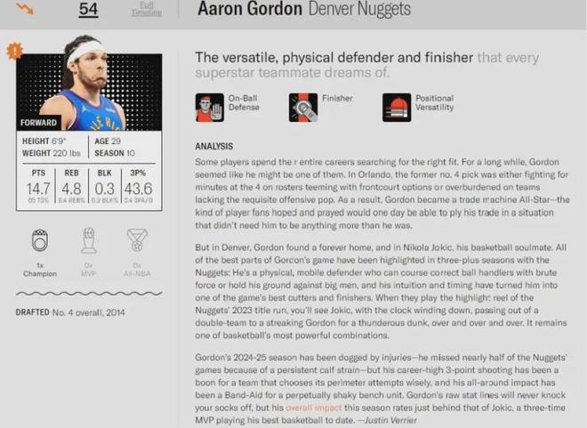 戈登的24-25赛季一直饱受伤病困扰,因为持续性小腿拉伤,他缺席了近一半比赛,但他投出职业生涯最高的三分命中率,对于一支外线出手选择非常精明谨慎的球队来说,这是一个福音,他的全能性,对于一支板凳阵容永远不靠谱的球队来说是个创可贴。戈登的基础数据永远不会让你大吃一惊,但他本赛季的整体影响力仅次于约基奇,而约基奇这位三届MVP打出了迄今为止最好的篮球表现。