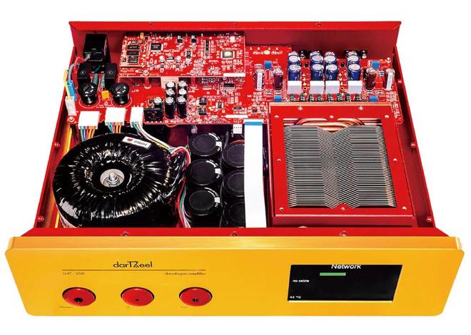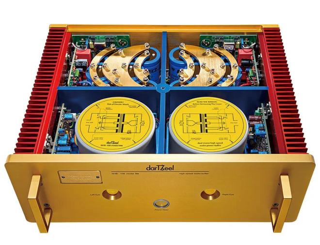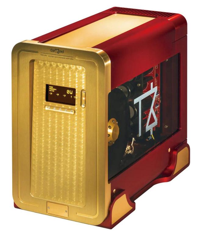 darTZeel器材的外观以贵族金色和火红色为两大元素,设计富有金属硬朗的气质,与“钢铁侠”如出一辙。机箱与面板据说采用了一种AW-5754(ALMg3)铝合金通过CNC加工制成。Hervé说这个颜色搭配来自我的想象,也许不是每个人一开始就喜欢这么鲜艳的色彩,他希望darTZeel功放不仅要有别于其他人的声音,还要有与众不同的外观。Hervé发现darTZeel功放和老木头家俱相当对搭,后来他获悉红色和金色(或黄色)是日内瓦官方指定的州旗颜色,算是一个美丽的巧合吧。
